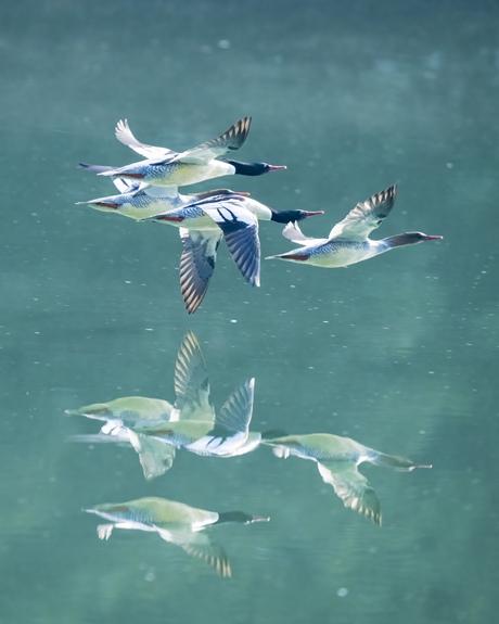 1月3日,在福建省永泰县嵩口镇梧埕村,中华秋沙鸭在闽江支流大樟溪上嬉戏飞翔。