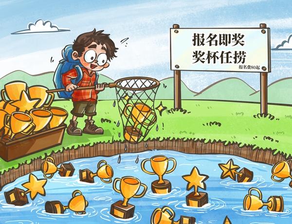 近期,大学生参加低质量竞赛即“水赛”的现象引发了社会关注。这些竞赛以低门槛和高获奖率为卖点,吸引学生参与,目的是在大学生综合素质测评中获得加分。然而,这些竞赛往往由商业机构组织,缺乏专业性和公正性。对此,教育部门应加强监管,确保竞赛的专业性和公正性。高校需要重新审视综合素质测评体系,减少对奖项和证书的依赖,更多关注学生的实际能力和素质。同时,学生本身也需要树立正确的竞争观念,避免盲目追求奖项。漫画:程璨