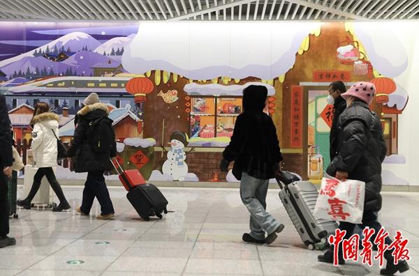 1月14日8时,兰州西站候车大厅,旅客耿新民和妻子拉着行李箱带着一双儿女,满载着一年的收获和提前置办好的年货,登上G430次列车,准备回老家沈阳。