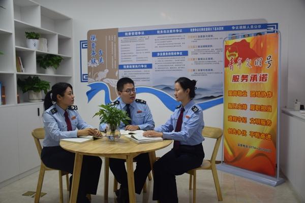 近年来,广西梧州高新区税务局团支部通过举办新税微课堂、设立青年自习室、开展“争当先锋”讨论、组建调研团队、争创“青年文明号”等方式,敦促青年干部端思而启智,切实将理论学习成果转化为推进税收工作的动力源。图为梧州高新区税务局“青年文明号”成员开展“争当先锋”讨论。蒋玲玲/摄