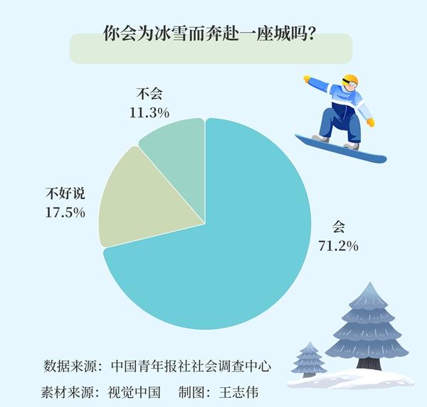 调查显示,71.2%的受访者会为冰雪而奔赴一座城。进一步分析发现,95后受访者表示“会”的比例更高,为78.8%;从所在地来看,一线城市受访者表示“会”的比例更高,为74.7%。