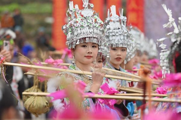 2月5日,苗族姑娘在融水苗族自治县杆洞乡百鸟衣芦笙坡会上进行民俗展演。