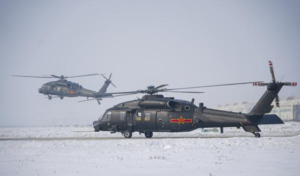 连日来,新疆军区某旅针对冬季气候特点,紧贴实战要求,坚持从难从严、按纲施训、科学组训,采取异地同步、多点同训的方式,在高原和平原地区同时组织飞行训练,锤炼部队在严寒条件下全时全域作战能力。图为直升机起降训练。姬建涛/摄