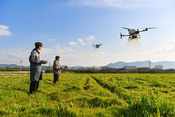 2月18日,浙江金华,在东阳市六石街道的高标准稻麦轮作田里,00后新农人飞手操控着植保无人机,为小麦开春拔节期进行施肥作业。视觉中国供图