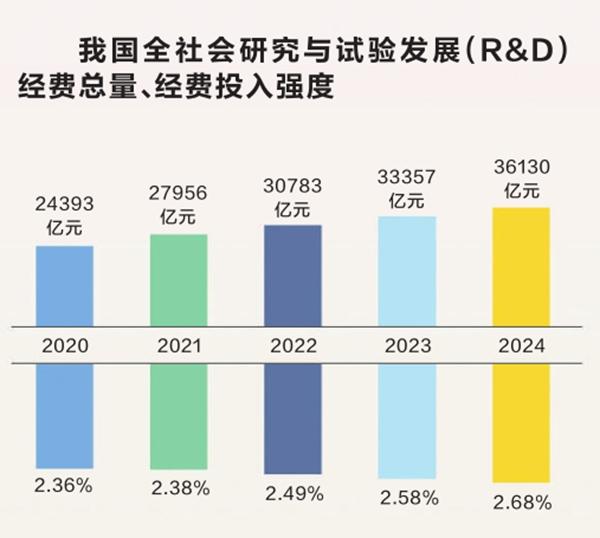 大国意志还体现在实实在在的投入里:2024年我国全社会研究与试验发展经费投入为36130亿元,投入总量稳居世界第二位,过去5年我国基础科学研究经费投入增加了1倍;也体现在不断升级的政策工具箱里:将制造业企业、科技型中小企业研发费用加计扣除比例提高至100%,赋予科研单位和科研人员更大自主权,将广大科技人员从繁杂的行政事务中解脱出来……