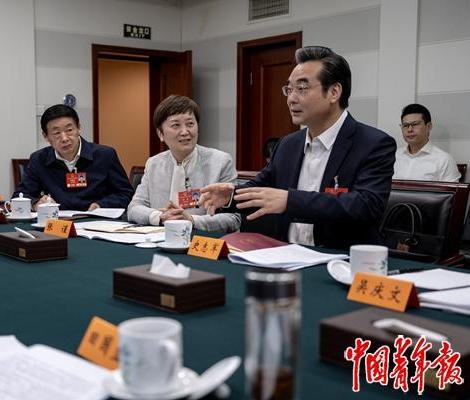 张谨的发言内容是持续推进城市更新和城镇老旧小区改造,统筹城市低效用地再开发,加快健全城市防洪排涝体系,加强燃气、给排水、热力、地下管廊等建设和协同管理。中青报·中青网记者 李隽辉/摄