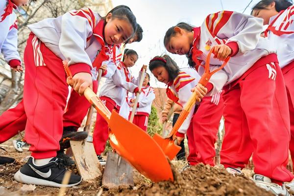 3月12日,天津市滨海新区塘沽实验小学学生在栽植树木。当日是植树节,各地开展植树活动,为春天增绿添彩。杜鹏辉/摄(新华社发)