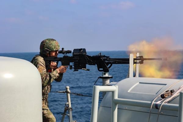近日,亚丁湾海域,海军第47批护航编队展开多课目实战化训练,提升编队机动协同、体系作战和应急处置能力,锤炼官兵组织指挥、专业技术素养和战斗意志。图为特战队员使用重机枪对海射击。王宁川/摄