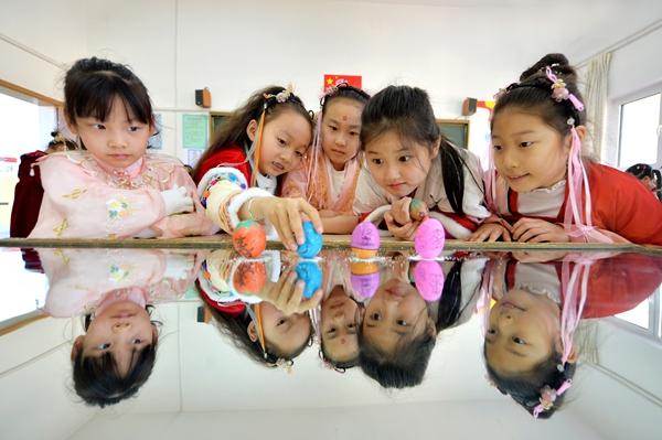 3月20日,学生们在山东青岛市实验小学开展的“传统习俗迎春分”主题活动中进行竖蛋游戏。当日是春分节气,各地开展各类春分节气品民俗活动。王海滨/摄(新华社发)
