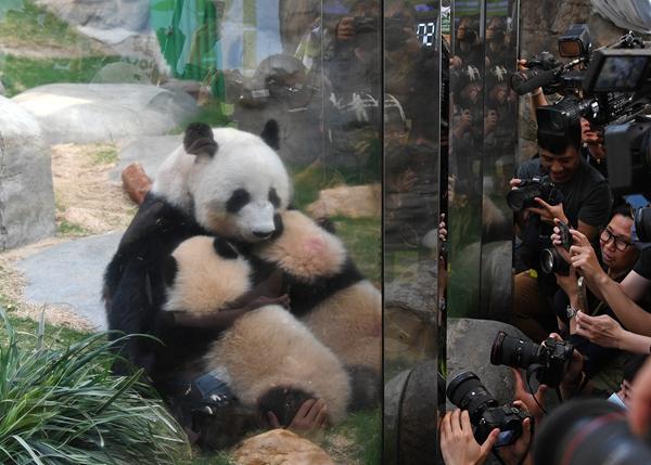 3月21日,媒体记者在香港海洋公园拍摄大熊猫“盈盈”和龙凤胎宝宝。 “港产”大熊猫龙凤胎宝宝及它们的妈妈“盈盈”将于3月22日在香港海洋公园与公众见面。这是这对大熊猫宝宝首度与妈妈同框亮相。新华社记者 陈铎/摄