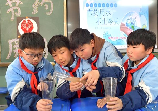 3月21日,河南省商丘市夏邑县育才学校的小学生在进行污染水过滤沉淀净水试验。3月22日世界水日前夕,各地举行丰富多样的主题活动,增强人们的节水护水意识。 苗育才/摄(新华社发)