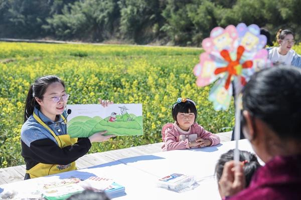 3月22日,东白湖镇的文化特派员给孩子和家长们开展春日读书会。 当日,浙江诸暨东白湖镇“茶文化暨油菜花活动”在万亩油菜花海中拉开帷幕。本次活动开展春日赏花、传统炒茶表演等一系列活动,吸引众多游客前来感受美丽乡村的诗意与美好,助力乡村旅游经济发展。新华社记者 徐昱/摄