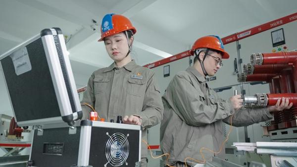 近年来,国网荆州变电检修分公司紧抓青年创新人才培养工作,发挥人才传帮带作用,提高业务水准为千家万户的用电安全保驾护航。图为90后青年人才突击队成员毛娇娜(左)和同事在实训基地用手车开关触头检测仪开展手车开关触头压力试验。刘远龙/摄