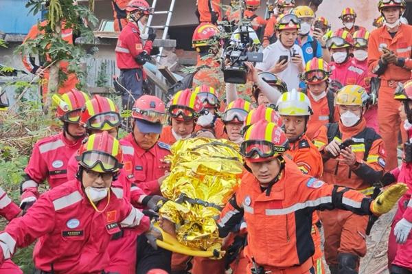 4月2日,在缅甸曼德勒,中国救援队伍救出一名幸存者。当地时间4月2日17点40分许,中国救援队伍在缅甸曼德勒市金色乡村酒店救援点成功救出一名男性,该男子为酒店员工,已被困超过120小时,被救出时生命体征良好。该名幸存者已转交缅甸当地医疗机构进行后续治疗。这是中国救援队伍救出的第9名幸存者。新华社记者 才扬/摄