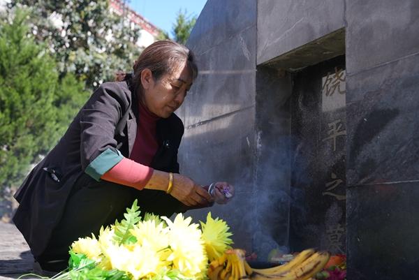 “阿妈来看你了,带了你最爱吃的饼子和糖。”饶平烈士墓碑前,65岁的嘎玛措姆佝偻着腰,从竹篓里掏出祭品摆放好,轻声呼唤着逝去的“兵儿子”。