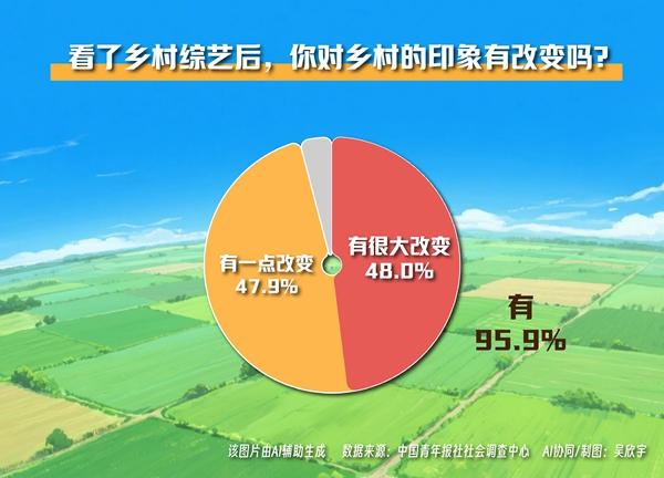 调查显示,95.9%的受访青年表示看了乡村综艺后,对乡村的印象有所改变。其中近五成(48.0%)受访青年觉得有很大改变。