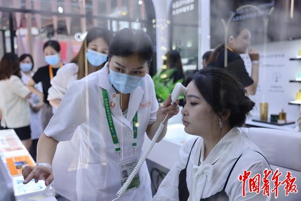 2022年7月26日,第二届消博会设立了法国馆,馆里一家护肤品品牌展位上,工作人员用AI智能测肤仪为参观者检测皮肤状况,这款测肤仪可将皮肤毛孔放大30倍并实时显示于屏幕上,检测报告可以发送至受测者的手机。中青报·中青网记者 曲俊燕/摄