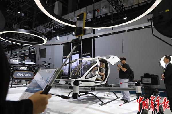 2025年4月15日,第五届消博会消费科技展区低空经济展示专区,一名网红博主在体验一款即将正式投入商业运营的无人驾驶载人航空器。中青报·中青网记者 孔斯琪/摄