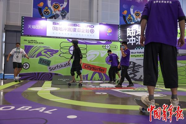 2022年7月26日,第二届消博会上,一家展位举办“陆地冲浪”教学活动。深受青年人喜爱的“陆地冲浪”不仅是一种锻炼,更具备社交功能。中青报·中青网记者 曲俊燕/摄