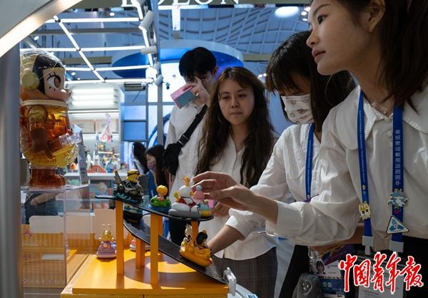 2023年4月13日,第三届消博会国货精品展区泡泡玛特展位中,参观者围观SPACE MOLLY等潮流玩具。中青报·中青网记者 李峥苨/摄