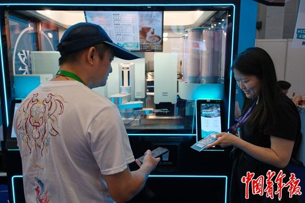 2024年4月14日,第四届消博会上,一名采购商与一家咖啡机器人的负责人交换联系方式。据负责人介绍,该咖啡机器人已出口美国、沙特阿拉伯、德国等13个国家。中青报·中青网记者 田嘉硕/摄