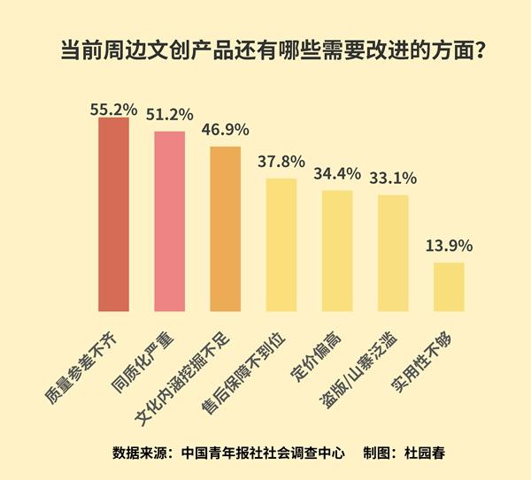 日前,中国青年报社社会调查中心联合问卷网(wenjuan.com),对1337名青年进行的一项调查显示,质量参差不齐、同质化严重、文化内涵挖掘不足是受访者认为当前周边文创最需要改进的3个方面。提升大众的周边文创消费体验,59.3%的受访青年期待搭建线上线下联动的“沉浸式”体验场景。