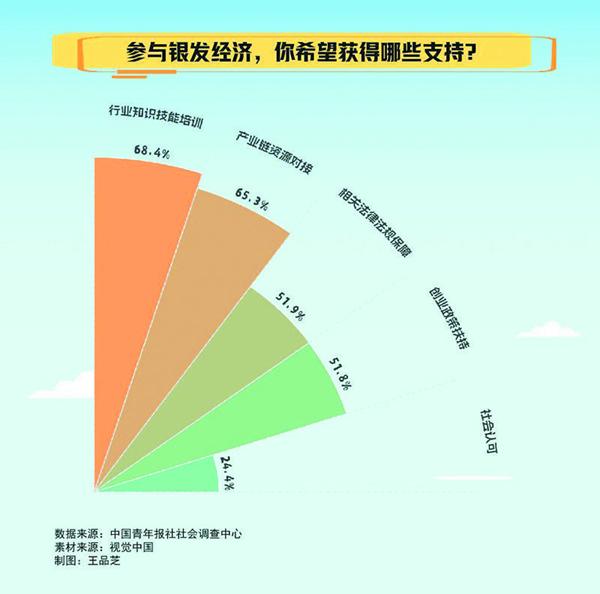 调查显示,参与银发经济,受访者希望获得行业知识技能培训(68.4%)、产业链资源对接(65.3%)、相关法律法规保障(51.9%)、创业政策扶持(51.8%)、社会认可(24.4%)等方面的支持。