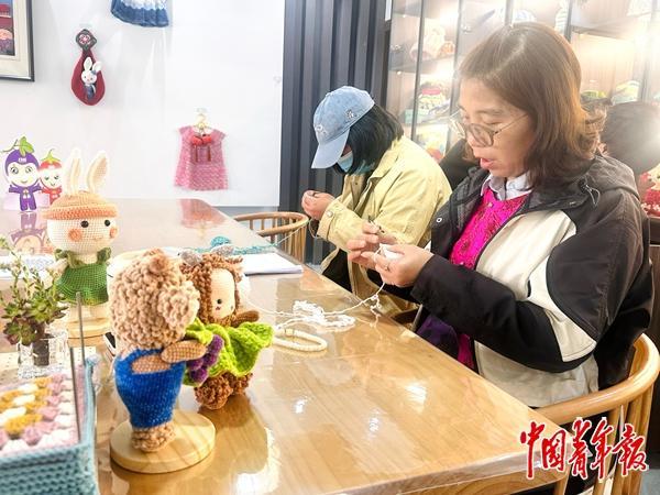 赵小玲是农垦建社区“家门口”就业服务站招收的第一批“织女”。她一直在家照看孙子,曾在小区周边餐馆帮厨,月薪约2000元。2022年3月,赵小玲开始到社区学习钩织,现在能制作手拎包、摆件、披肩等,每月能挣近4000元手工费。“社区二楼有儿童活动区,我做钩织时可以把孙子放在那里。这里工作环境和收入比之前在餐馆打工好,还能把针线带回家做。”赵小玲说。