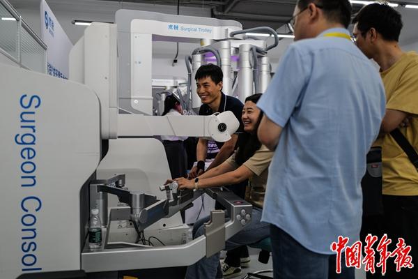 6月18日,北京中关村医疗器械园,媒体工作人员在体验医疗手术机器人设备。当日,“活力中国调研行”主题采访活动来到这里。近年来,北京市将医药健康产业作为创新发展的“双发动机”之一,滚动实施三轮加快医药健康产业协同创新发展的“三年行动计划”。中青报·中青网记者 赵迪/摄