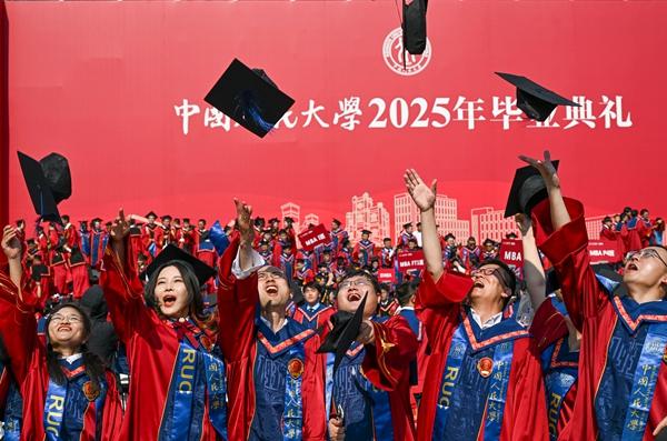 6月23日,毕业生在中国人民大学毕业典礼后抛帽庆祝。当日,中国人民大学举办2025年毕业日系列活动,包括毕业典礼、学位授予仪式、青春歌会等。据了解,今年中国人民大学共有8390名毕业生学成毕业,踏上崭新的人生旅程。新华社记者 陈朔/摄