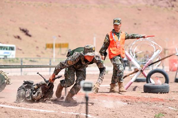 7月15日,“锋刃-2025”国际狙击手射击竞赛在新疆乌鲁木齐武警某训练基地开幕。这是开幕式后,中国人民武装警察部队参赛选手进行“声响掩护隐蔽狙击”课目竞赛。侯崇慧/摄
