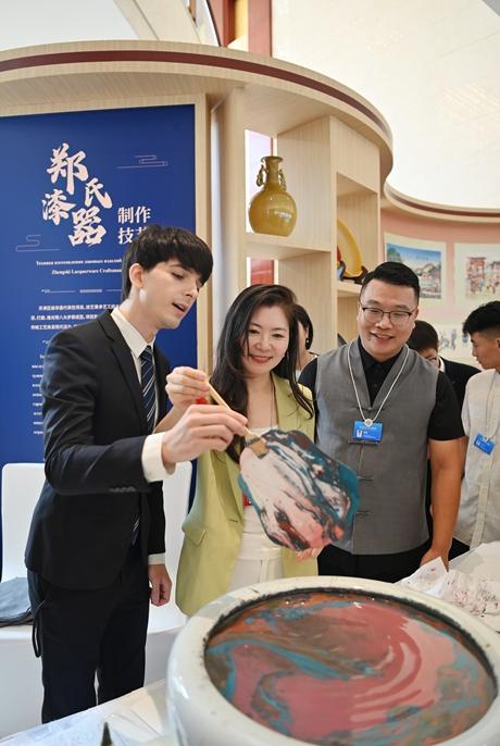 7月23日,参会者在天津非遗展上体验漂流漆技法。当日,由国务院新闻办、中国外文局、上合组织秘书处联合主办的2025上合组织国家文明对话在天津举行。第八届上合组织国家中文书法展、天津非遗展等活动也同期举办,充分展示上合组织国家多彩文化的交融互鉴。新华社记者 李然/摄