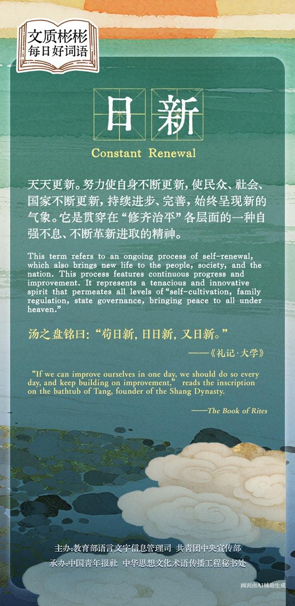 This term refers to an ongoing process of self-renewal, which also brings new life to the people, society, and the nation. This process features continuous progress and improvement. It represents a tenacious and innovative spirit that permeates all levels of "self-cultivation, family regulation, state governance, bringing peace to all under heaven".