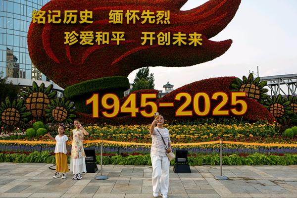 8月18日,北京东单,纪念抗战胜利80周年主题花坛吸引人们前来拍照。姚沐含/摄