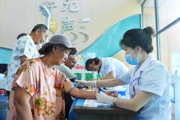 8月18日,在山东省青岛市城阳区夏庄街道社区卫生服务中心,医生为社区居民义诊。