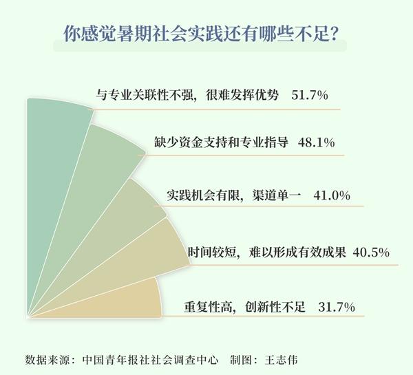 提高大学生暑期社会实践质量,63.4%的受访大学生希望高校与企业、地方对接,打造社会实践合作基地,52.6%的受访大学生希望安排专业老师,及时为学生提供指导和服务,48.3%的受访大学生建议引导学生把社会实践与专业、兴趣相结合。