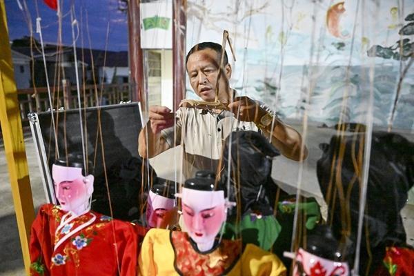 8月21日,江西省广昌县头陂镇西港村的夏夜人声鼎沸。村口戏台上,鼓点铿锵、灯影摇曳,塘坊木偶戏《永乐观灯》正唱到高潮。启新木偶戏剧团的几名演员,操纵木偶、伴奏唱腔,配合默契。