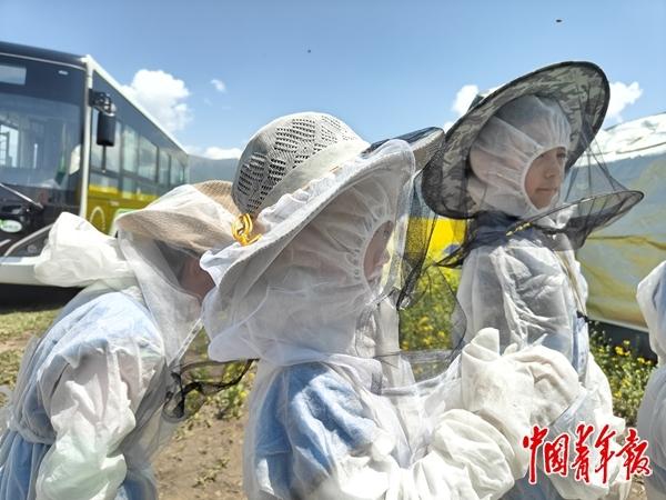 青海海北州夏季平均气温通常在15摄氏度至23摄氏度,虽艳阳高照但气候凉爽,非常适宜避暑旅游。蜜蜂“嗡嗡”地在油菜花丛中穿梭,研学团队的孩子们穿戴好特制的防蜂装备进入油菜花田,观察蜜蜂、聆听关于蜜蜂习性的讲解。