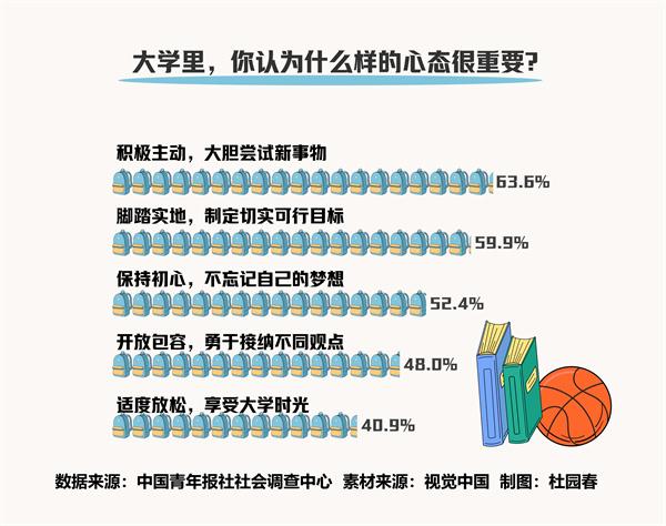 秋季学期伊始,大一新生陆续报到了。怀揣憧憬与梦想,他们会以什么样的心态开始大学生活?更好地适应大学生活,他们有哪些期待?上周,中国青年报社社会调查中心联合问卷网(wenjuan.com),对1500名大一新生进行的一项调查显示,63.6%受访大一新生认为在大学里要积极主动,大胆尝试新事物。69.3%的受访大一新生期待学校组织丰富多样的素质拓展活动。