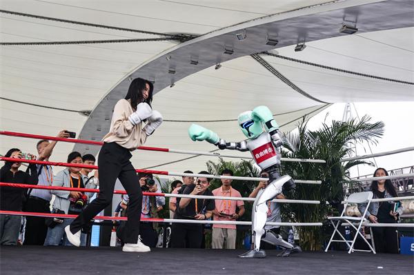 9月10日,北京,2025年中国国际服务贸易交易会在北京首钢国际会展中心举行。天工和宇树等诸多明星机器人亮相,宇树的自由搏击机器人与参观者互动。视觉中国供图
