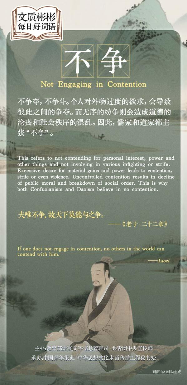 This refers to not contending for personal interest, power and other things and not involving in various infighting or strife. Excessive desire for material gains and power leads to contention, strife or even violence. Uncontrolled contention results in decline of public moral and breakdown of social order. This is why both Confucianism and Daoism believe in no contention.