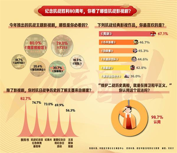 近日,中国青年报社社会调查中心通过共青团中央微信公众号、中国青年报社全媒体矩阵进行的一项有10306名受访者参与的调查显示,在今年推出的抗战主题影视剧中,《南京照相馆》(80.0%)和《731》(79.0%)是受访者表示必看的两部。