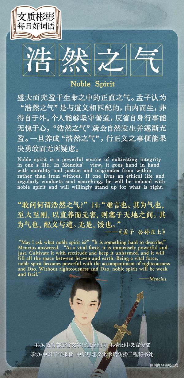 盛大而充盈于生命之中的正直之气。孟子认为“浩然之气”是与道义相匹配的,由内而生,非得自于外。个人能够坚守善道,反省自身行事能无愧于心,“浩然之气”就会自然发生并逐渐充盈。一旦养成“浩然之气”,行正义之事便能果决勇敢而无所疑虑。