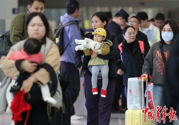 10月8日,北京朝阳站,旅客抱着孩子离开出站口。当日是国庆中秋长假的最后一天,各地迎来返程高峰。据国铁集团消息,10月8日全国铁路预计发送旅客2175万人次,铁路国庆中秋假期运输自9月29日启动到10月7日,已发送旅客超1.6亿人次。中青报·中青网记者 陈剑/摄