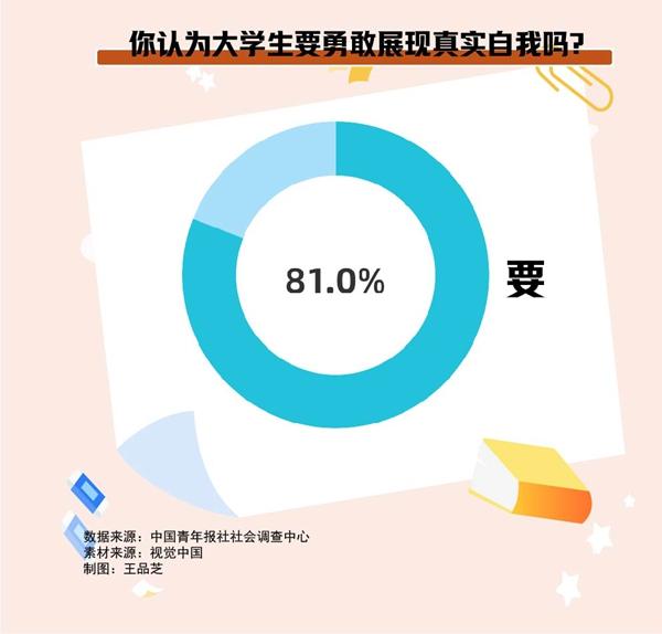 大学期间是培养社交能力的重要时期。调查中,81.0%的受访者认为大学生要勇敢展现真实自我。