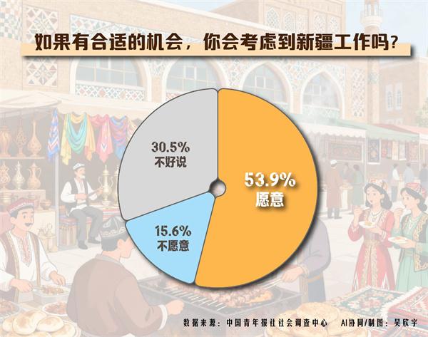 随着新疆加大人才引进力度、推进产业发展升级,这片热土正成为青年实现自我价值的广阔舞台。上周,中国青年报社社会调查中心联合问卷网(wenjuan.com),对1668名青年进行的一项调查显示,超九成(94.6%)受访青年看好新疆未来发展。如果有合适的机会,过半(53.9%)受访青年考虑到新疆工作。
