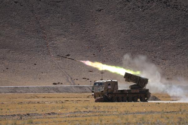 近日,陆军第76集团军某旅在海拔4000多米的某高原训练场,开展跨昼夜实弹射击训练,检验火力分队协同作战和火力打击能力。图为某型火箭炮发射瞬间。刘继扬/摄