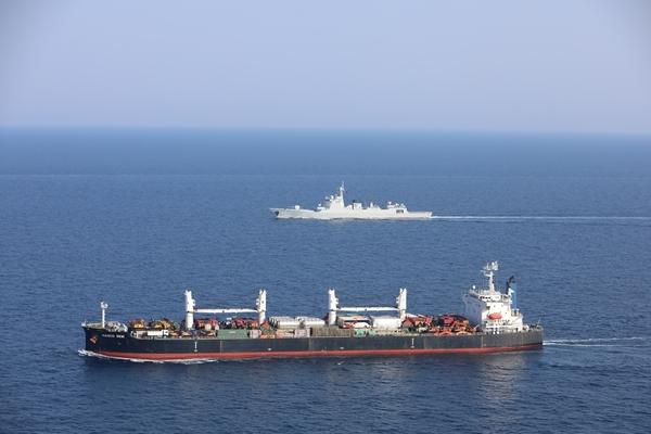 当地时间11月4日傍晚,随着巴拿马籍杂货船“南远宝石”号安全抵达亚丁湾西部某海域,海军第48批护航编队顺利完成独立指挥实施的首批护航任务。图为唐山舰为巴拿马籍散货船“南远宝石”号护航。杜江帆/摄