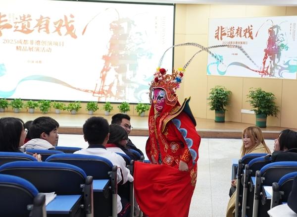 11月19日,川剧变脸演员蒋莹与观演的学生们互动。当日,“非遗有戏”2025成都非遗创演项目精品展演活动走进位于成都市的四川师大附中高中部,成都市非遗保护中心曲艺团演员为学生们表演了四川清音、四川扬琴、金钱板、川剧变脸等国家级非遗项目,让孩子们近距离感受传统艺术的独特魅力。吕明响/摄(新华社发)