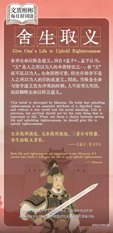 舍弃生命以保全道义。出自《孟子》。孟子认为,“义”是人之所以为人的本质特征之一,舍“义”而不足以为人。生命固然可贵,但生存却并不是人之所以为人的目的或意义。因此,当保全生命与坚守道义发生冲突的时候,人不应背义苟活,而应牺牲生命以捍卫道义。